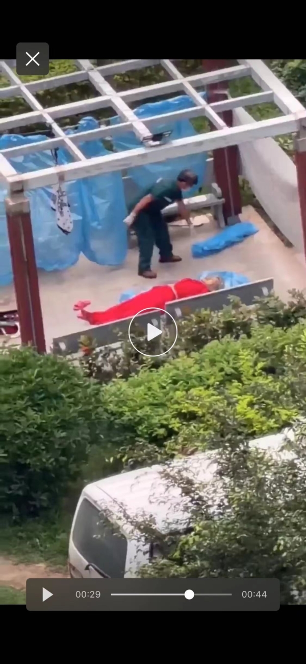 當地網民稱,事發汕尾市海豐縣的海富豪庭小區。照片和視頻顯示,一名老人一身紅衣,在小區花園的涼亭內上吊身亡,有工作人員在處理遺體。
