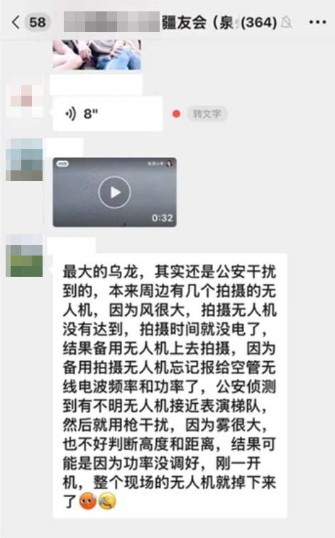 當地無人機愛好者圈子傳出的消息稱,這場事故的主要原因,是本應給表演「護航」的公安閙烏龍導致。因為現場風大,原來安排的拍攝的無人機無法拍攝,只好啓用備用無人機,但備用無人機忘了給空管報備。公安判定為「不明無人機接近表演梯隊」,馬上發射干擾信號,結果沒掌握好距離和功率,反而擊落了大量表演的無人機。