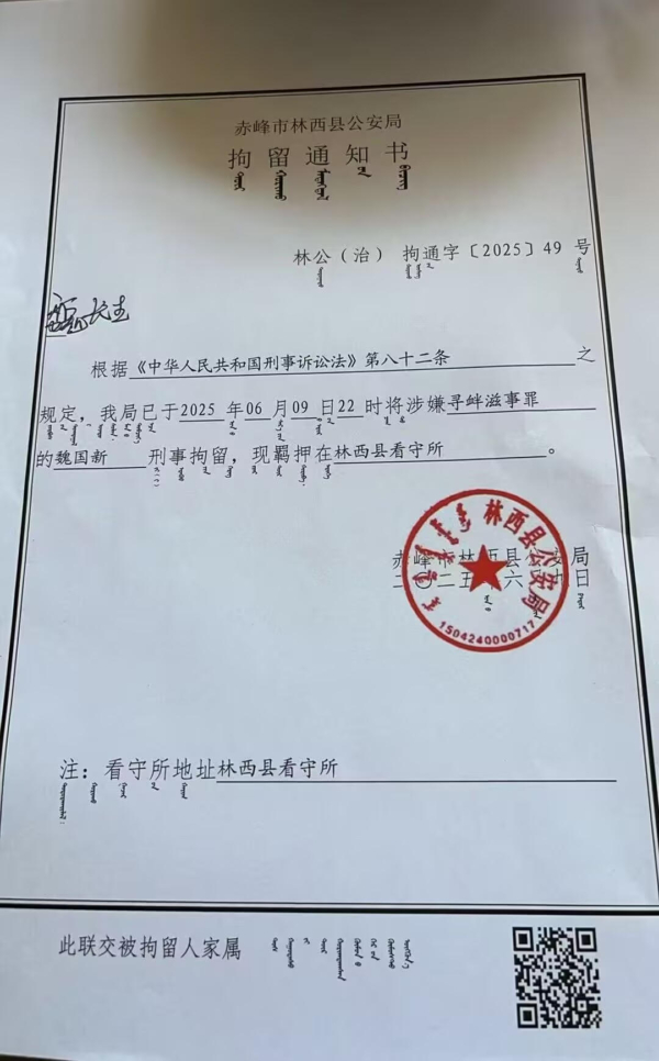 2025年6月9晚上,正在林西縣火車站候車準備去呼和浩特市上訪並藉此向中央駐呼和浩特市的巡視組遞交申訴材料的村婦魏國新卻莫名其妙的遭到了林西縣公安局派來的多名工作人員的強行攔截與圍堵,在沒有與警方工作人員發生任何言語及肢體衝突的情況下,魏國新於當日晚上被林西縣警方以涉嫌尋釁滋事罪予以強制性的刑事拘留,目前她被關押在林西縣看守所裡。