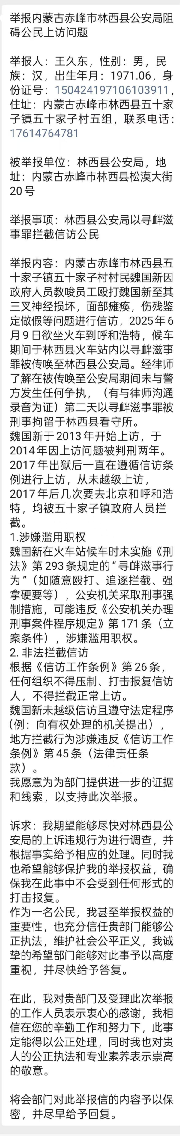 2025年6月9日晚,內蒙古自治區赤峰市林西縣公安局工作人員無正當理由地將正在林西縣火車站候車,準備去呼和浩特市遞交上訪申訴材料的該縣五十家子鎮村婦魏國新非法強行的圍堵攔截下來,並於當日晚上違法違規且強制性的傳喚押解帶回至林西縣公安局,最終以涉嫌尋釁滋事罪對其正常上訪行為做出刑事拘留。此舉在內蒙古赤峰市林西縣當地產生極其惡劣的社會影響,甚至已經激起民眾的憤怒。