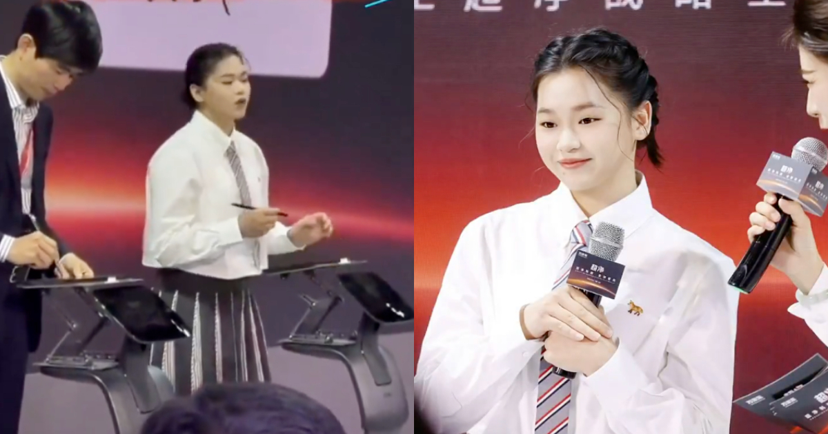 當天,全紅嬋穿了一件白色襯衫,搭配灰色百褶裙,腳上則是一雙厚底的馬丁靴,看起來就是一個學生打扮,很符合她的年齡。