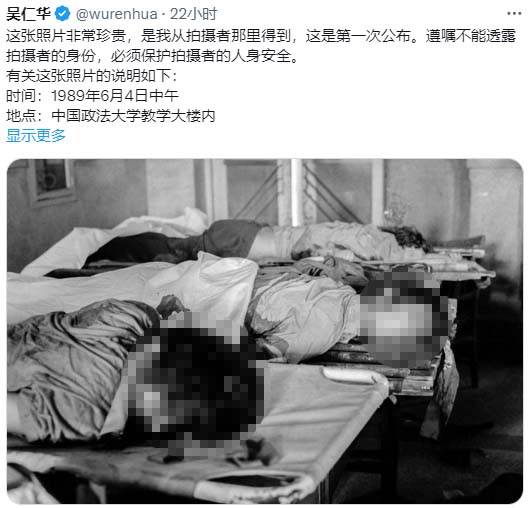 不過,這篇推文也引來衆多「五毛」,他們引用各種所謂的「證據」,試圖否定這張照片的真實性。對此,吳仁華跟帖評論,「我發布了這張六四死難學生的照片,引來了眾多的五毛、自乾五,好久沒有出現這樣的情況了,看來是戳到了中共的痛處。」
