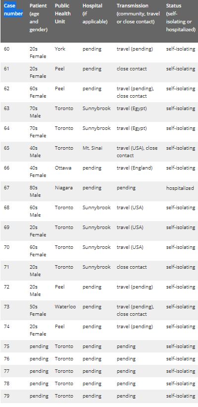 安省衛生官週五宣布週四晚以來又新增19人感染新型冠狀病毒,令安省感染個案增至79宗。