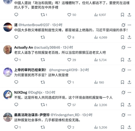 還有人說,「有時候真的覺得,這些報復社會的事情發生,其實我們全部國民都有責任,並沒有誰是無辜的。我們讓渡了自己的權利為了求得一時苟且和安寧,但是蒼天不會饒過誰,當鐵拳錘向個體,當個體權利無法保障,冤屈無法申訴,所有人都會有受害的那天。」