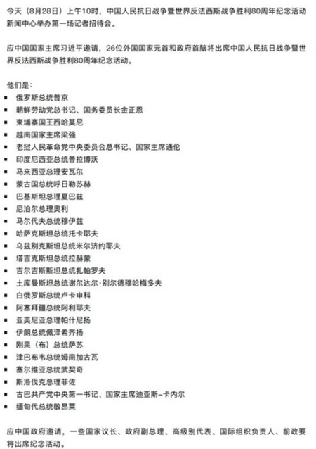 中共定於9月3日在天安門廣場舉行所謂的「抗戰勝利80周年閱兵」,8月28日下午,中共外交部在例行的新聞發布會上,公布了參加九三閱兵的外賓名單,其中包括俄羅斯的普京、朝鮮的金正恩,以及柬埔寨、越南、伊朗、古巴、緬甸等國領導人,但名單中未見西方主流國家政要,引發外界關注。