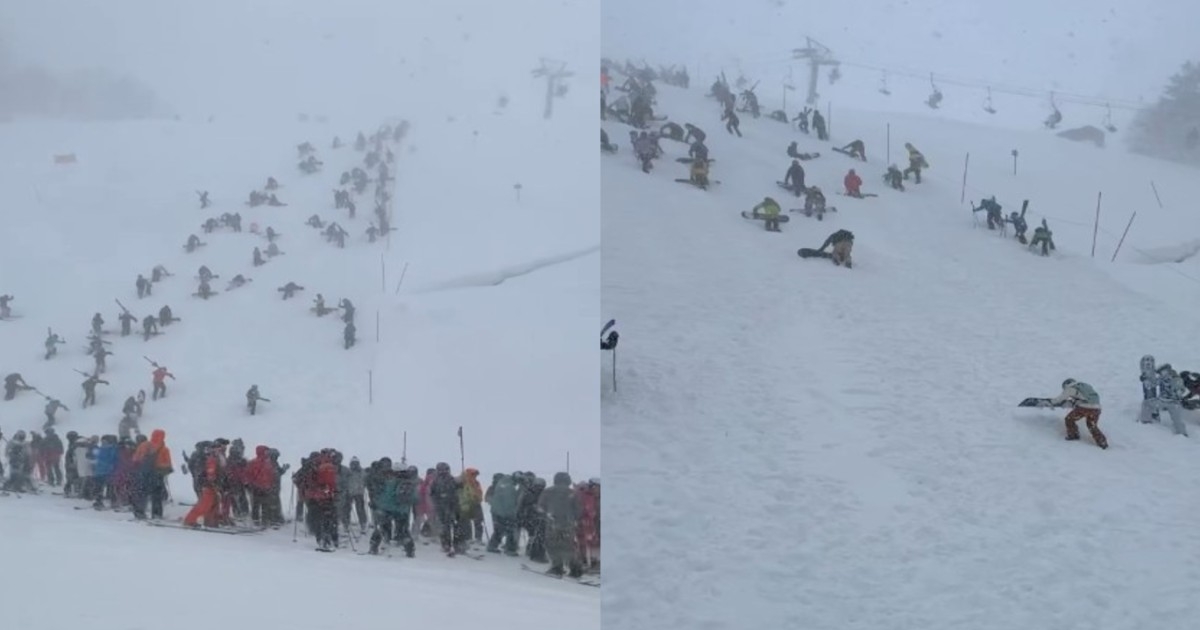 從拍攝者的視頻中可看到,白雪皚皚的山頭,放眼望去滿滿滑雪客,有的在大雪下排隊等纜車,有的爬上山坡、手腳並用,一步一步往上爬,有人不小心就滑了下來。