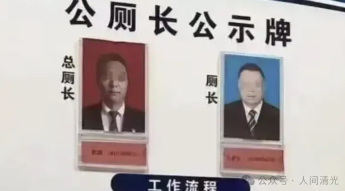 之前也有過類似報導,比如公廁長公示牌上列出一名總廁長和一名廁長,上面還仔細地寫明工作流程,有檢查,有督導,還有相應的衛生標準。
