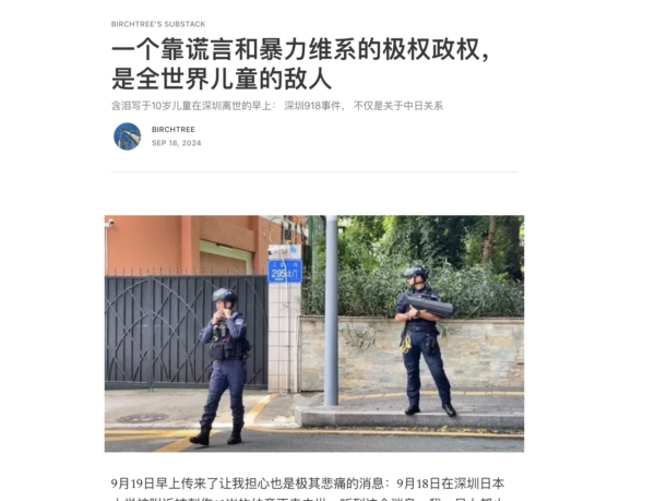【新唐人北京時間2024年09月25日訊】9月18日,在深圳日本兒童遇襲身亡後,在日本的華人博客作家BirchTree撰文《一個靠謊言和暴力維繫的極權政權 是全世界兒童的敵人》。文章說,中共極權不僅傷害外國兒童,而且,對內,是更大規模更深重的暴力殘害弱者,中共極權是全世界兒童的敵人。