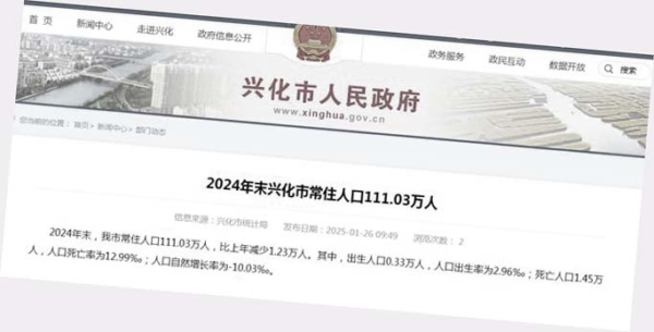 此前1月26日,台州市代管的縣級市興化市也公布了2024年末人口數據,聲稱該市2024年末常住人口較上年減少1.23萬人,降幅10.03‰。2024年出生人口0.33萬,死亡人口1.45萬。