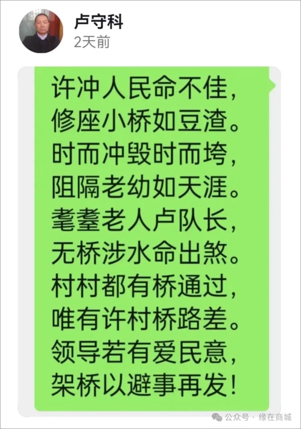 前天,一位盧姓8旬老人,因不敢走這個臨時搭著的「獨木橋」,而不得不淌水過河,雖然河水不深,可顫顫巍巍的老人,還是滑倒在河水裡,再也沒能站起來…已退休的盧守科老師,是溺亡老人的同族人,盧老師在8旬老人淌水過河溺亡後,寫了一首小詩發在網上: