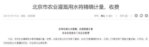 其實,早在2017年7月,北京市黨媒就曾報導,全市1.7萬眼灌溉機井安裝了智能計量設施,從此京郊農業灌溉用水「都將精確計量、收費」。