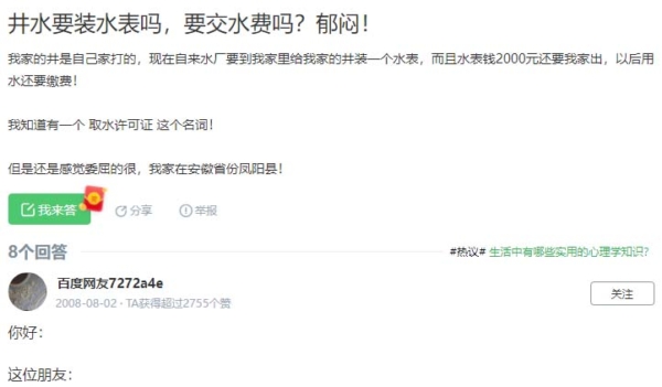 更早前的2008年,就有安徽鳳陽縣的農民在知乎網站上發帖稱,「我家的井是自己家打的,現在自來水廠要到我家裡給我家的井裝一個水表,而且水表錢2000元還要我家出,以後用水還要繳費!」