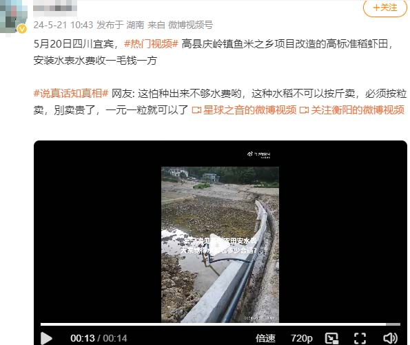 5月20日,四川宜賓市高縣慶嶺鎮網民分享照片和視頻,顯示當地所謂的「高標準稻蝦田」都安裝了水表。網友們紛紛感嘆,使用自然水源灌溉農田也要收費,聞所未聞。
