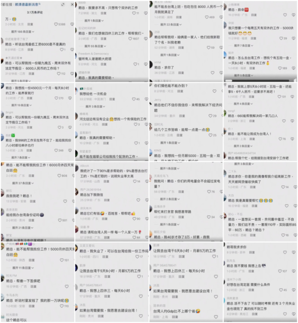 還有些網友表示:「賴總,我不要錢,我想上(台灣)島「賴總,能不能讓我成為台灣人」「好想在台灣定居,需要什麼條件?」「賴總,幫我個忙,給我接到台灣安排工作吧!」