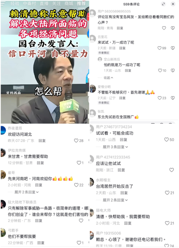 不過,在大陸社交媒體有關國台辦的官媒報導下面,各地網友紛紛向賴清德發出邀請:「歡迎訪問湖北」「來甘肅,甘肅需要幫助」「先來河南吧,河南歡迎你」「東北先試後在全國推廣」「來試試,萬一成功了呢?」「試試看,可能會成功」「應該讓他試試」,同官方口徑完全不同調。