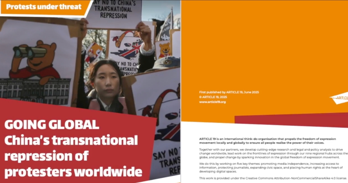 【新唐人北京時間2025年06月07日訊】6月4日,中共1989年血腥鎮壓天安門抗議運動紀念日的當天,位於英國的國際言論自由組織「第十九條」發表報告,揭露中共如何針對境外抗議人士,及其人權記錄的批評者,展開系統性的跨國鎮壓,並指出,中共跨國鎮壓是全球最複雜、規模最大的、有組織鎮壓行動。