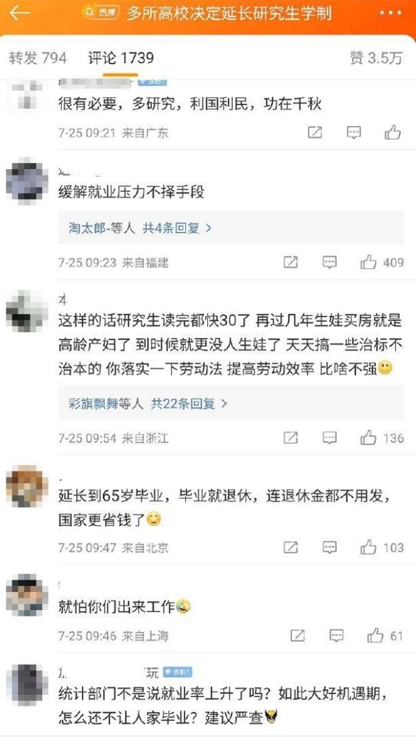 許多微博網友紛紛留言嘲諷:「緩解就業壓力不擇手段」、「天天搞一些治標不治本的」、「最好碩士讀八年,博士讀十年,畢業就不用為找工作發愁了」、「然後研究生畢業出來,卡年齡又找不到工作」、「延長到65歲畢業,畢業就退休,連退休金都不用發」。