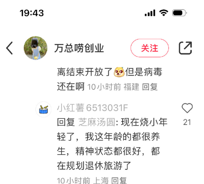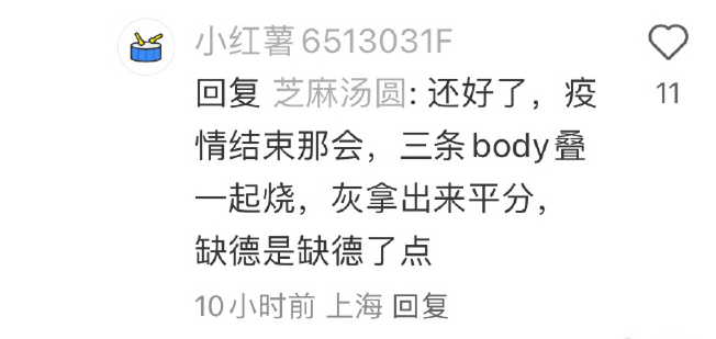 一名IP位置顯示為上海的網友回覆說,殯葬(業),「清零」防疫剛結束的時候,遺體燒都燒不完,「夠吃好幾年了」。