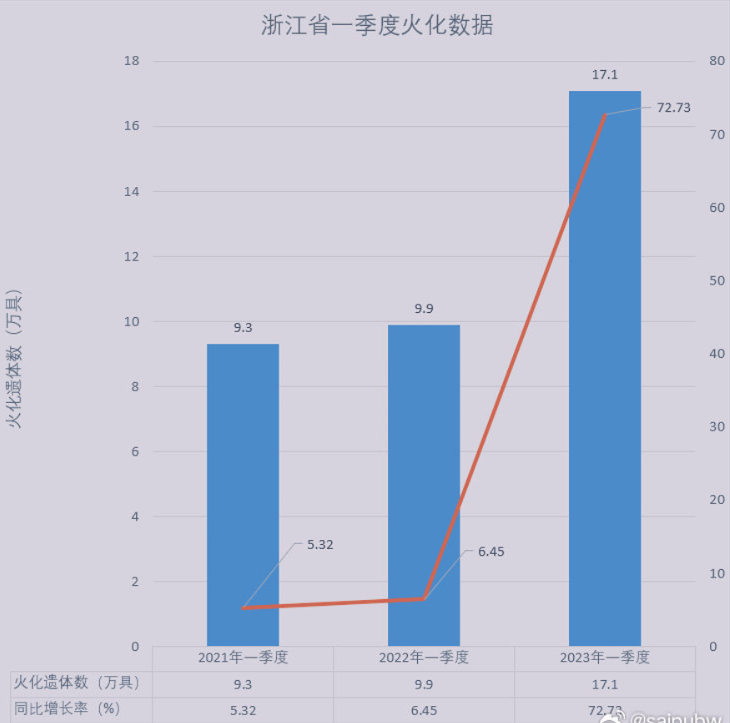 2023年7月13日,浙江省民政廳公布2023年一季度的統計數據,其中火化遺體數達17.1萬具。有網友查詢發現,2022年一季度的數據是9.9萬具,同比增長高達72%。該消息迅速在網絡引發熱議。浙江省民政廳隨後從官網刪除了該數據。