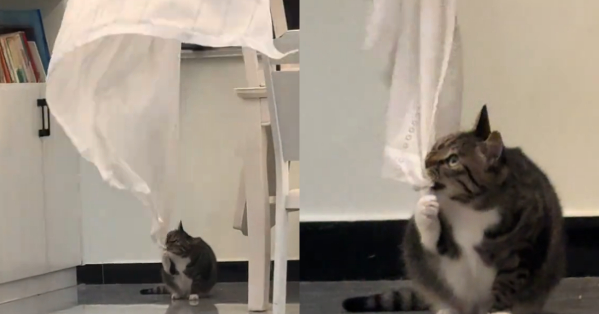 有網友在社交媒體上傳的視頻顯示,當時,家裡的窗簾被風吹得四處飄揚,貓咪一直用嘴死死咬住窗簾的一角不放。中途,貓咪沒咬緊,窗簾又被風吹起來了,它又撲上去緊緊咬住,可愛模樣相當逗趣。