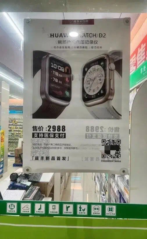 宣傳海報顯示,該款產品名為「HUAWEI WATCH D2 腕部動態血壓記錄儀」,售價2988元(人民幣),「支持醫保支付」。