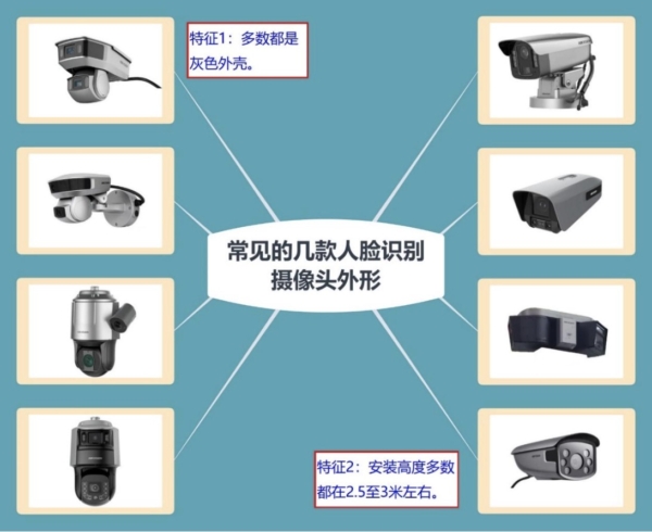 那麼如何辨別哪些攝像頭是帶人臉識別功能的呢?「清風」說到:「帶人臉識別功能的攝像頭一般安裝在人流密集和安全需求高的區域,如火車站、地鐵站、機場、旅館、公交車站、商場、公園、廣場、體育場館及娛樂場所的出入口,以及一些交通要道和人行通道的路口正前方等位置。這些攝像頭通常安裝在2.5至3.5米左右的高度,比普通攝像頭略低,以便捕捉更清晰的人臉圖像。近年來,公共區域廣泛安裝的人臉識別攝像頭多數為灰色外殼,體型偏大。」如下圖所示: