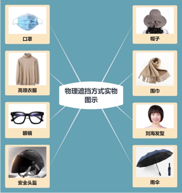 這是最直接、便捷的防護手段。通過合理穿戴口罩、眼鏡、圍巾、帽子等物品,最大限度的遮擋面部特徵,可以有效降低人臉識別系統提取完整特徵信息的成功率。