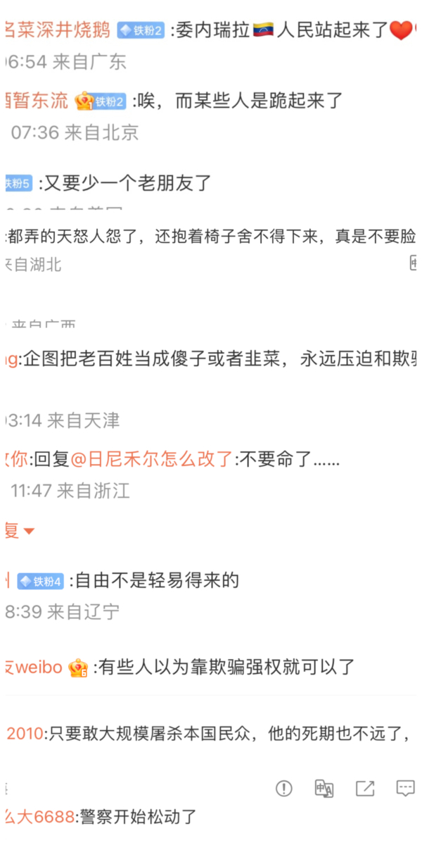 就在抗議愈演愈烈之際,中共當局則迅速向馬杜羅表示祝賀。不過,在大陸微博等社交媒體上一些委內瑞拉民眾抗議視頻下面,儘管網絡上照舊有一些五毛和粉紅指責美國,但同時有大量評論支持示威者,明嘲暗諷,影射中共獨裁政權「賴著不下台」。