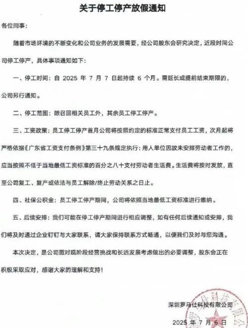 當地時間7月6日凌晨,羅馬仕科技有限公司(簡稱「羅馬仕」)的官方網站發佈了停工停產通知。根據這份通知,該公司決定從7月7日起持續停工停產6個月,如果需延長或提前結束期限,公司將另行通知。