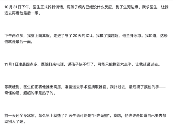 「11月1日凌晨4點多,醫院打來電話,說孩子快不行了,可能只能撐到6點半,讓我趕緊過去。等我趕到,醫生們正將他推出病房,準備送去手術室摘取器官。我撲過去,最後摸了摸他的手——奇怪的是,超超的手是熱乎的。前一天還全身冰涼,怎麼早上就熱了?」