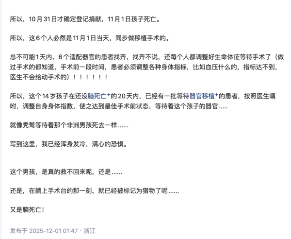 網友質疑,「10月31日才確定登記捐獻,11月1日孩子死亡。所以,這6個人必然是11月1日當天,同步做移植手術的。總不可能一天內,6個適配器官的患者找齊,找齊不說,還每個人都調整好生命體徵等待手術了(做過手術的都知道,手術前一段時間,患者必須調整各種身體指標,比如血壓什麼的,指標達不到,醫生不會給動手術的)!!!!!!」