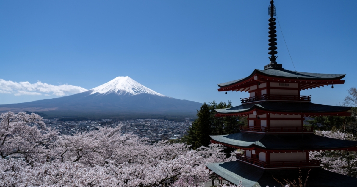 白雪皚皚的富士山之下,「新倉山淺間公園」內櫻花盛開,淺粉色的花海,跟朱紅色的五重塔相互輝映,景色讓人沉醉。