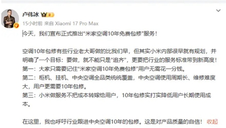小米集團總裁盧偉冰19日晚在直播中宣布,米家空調正式推出「10年免費包修」服務。只要在2025年1月1日起完成首次安裝的米家空調,都能升級10年免費包修服務。