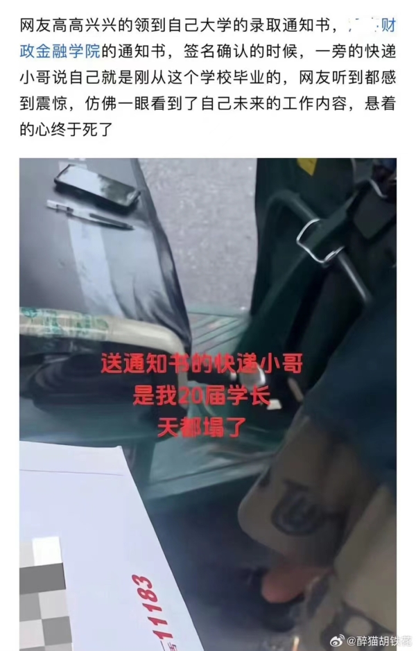 近日,一則「高考生收取錄取通知書,快遞員是同校學長」的消息,更加劇了人們對大學生就業前景的失望情緒。