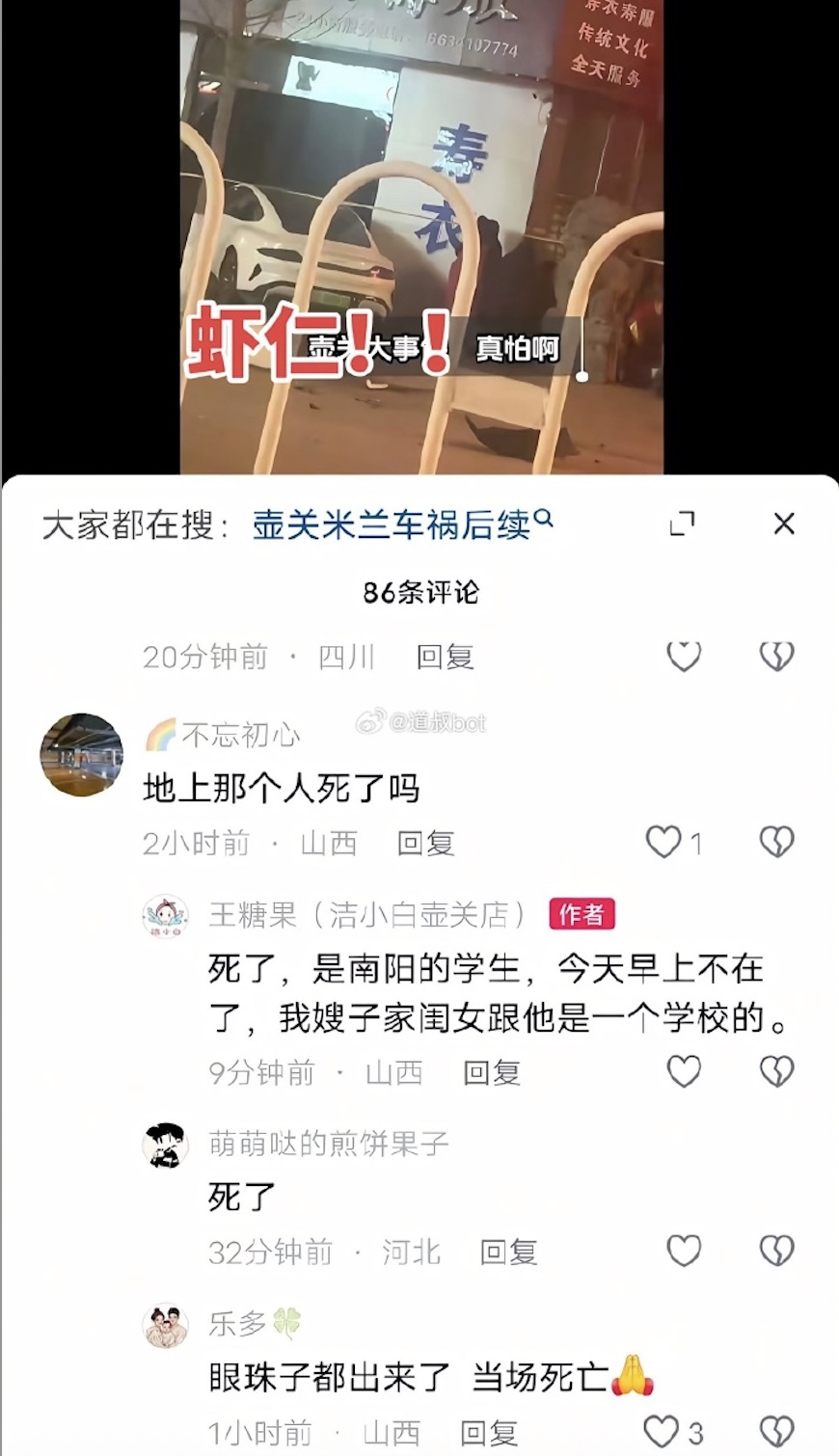 疑似知情網友發帖說,被撞的電動車車主是南陽的學生,已經離世。