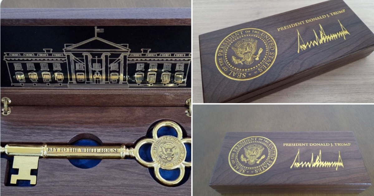 「白宮黃金鑰匙」是由川普親自設計、專門贈與重要貴賓的紀念品,上面刻有總統徽章,以及「白宮鑰匙(KEY TO THE WHITE HOUSE)」字樣,僅打造了五枚,李在明獲得最後一枚金鑰匙。