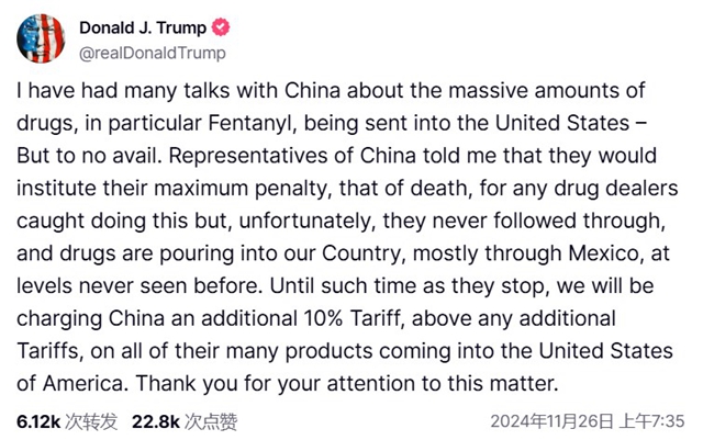 【新唐人北京時間2024年11月26日訊】11月26日,美國總統當選人川普(特朗普)宣布,他一上任就會對中國進入美國的所有產品加徵10%關稅,這是他在大選後針對關稅方面最清晰的一次表態。