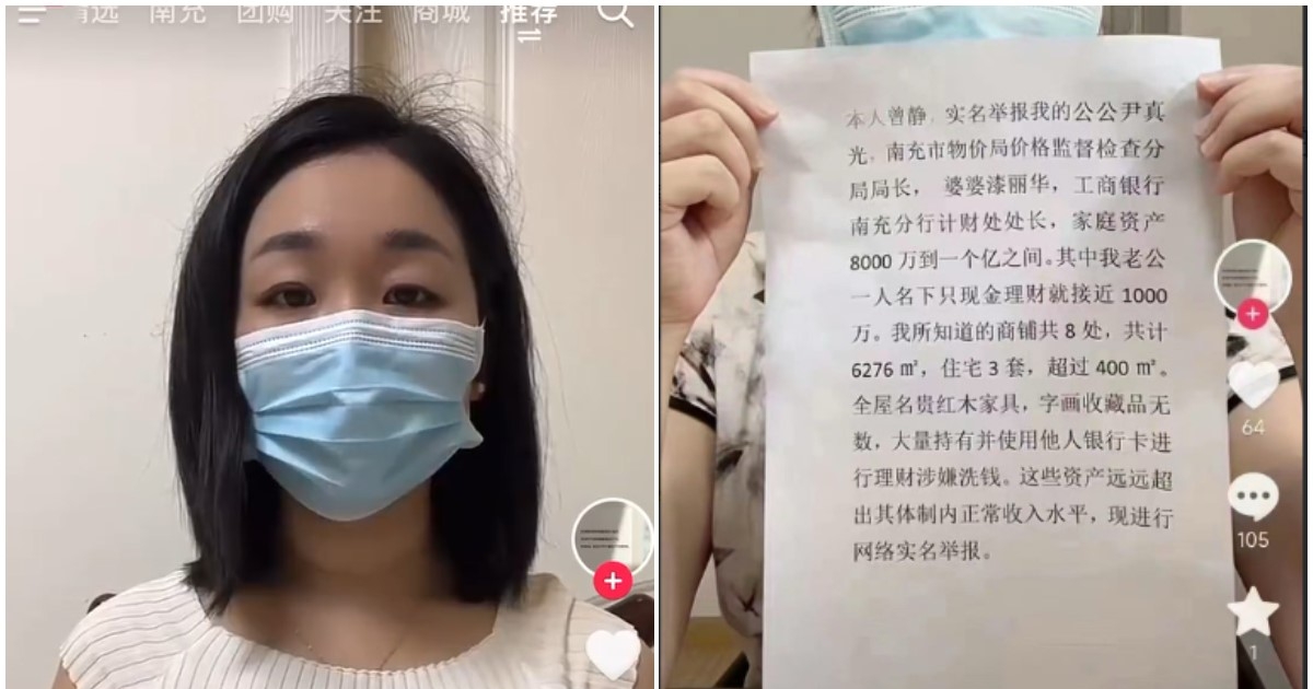 在視頻中,該女子拿著身分證,說自己名叫曾靜,她公公尹真光,是南充市物價局價格監督檢查分局局長,她婆婆漆麗華,是工商銀行南充分行計財處處長,她公公婆婆家庭資產有8,000萬到一個億,她知道的資產就有8處商鋪,總面積超過6,267平米,3套住宅,總面積超過400平米,還有大量貴重紅木家具和收藏的字畫,資產超過了在體制內工作人員的正常收入水平。