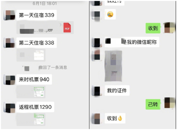 項先生提供的多張微信截圖及轉帳截圖顯示,一自稱是河南省濮陽市公安局華龍區分局的警察付某,用微信向他母親發出了住宿發票、往返機票截圖及自己的警察證照片等,並寫明「第一天住宿339元」「第二天住宿338元」「來時機票940元」「返程機票1290元」,合計2907元。此後項先生母親向對方轉帳3000元。