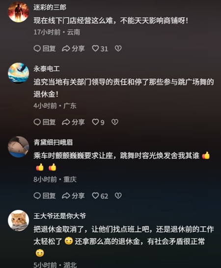 上述事件一度登上熱搜,網友幾乎一面倒批評廣場舞大媽,「給了新場地不去,非要堵人家門口。這哪是鍛鍊,分明是耍無賴」「現在線下門店經營這麼難,不能天天影響商鋪呀」「人家一個月房租都得上萬,你不讓人家好好做生意」「要徹底解決這個問題,只有判火鍋店老闆正當防衛」。