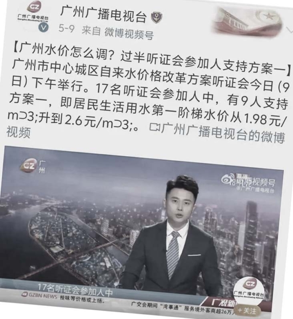 這一波輿論熱潮源於廣州當局5月9日的水費漲價通知。當天多家當地官媒宣稱,廣州市舉行所謂「中心城區自來水價格改革方案聽證會」,投票通過了水價調整方案,並且17名聽證代表「均表示理解和支持水價調整」云云。