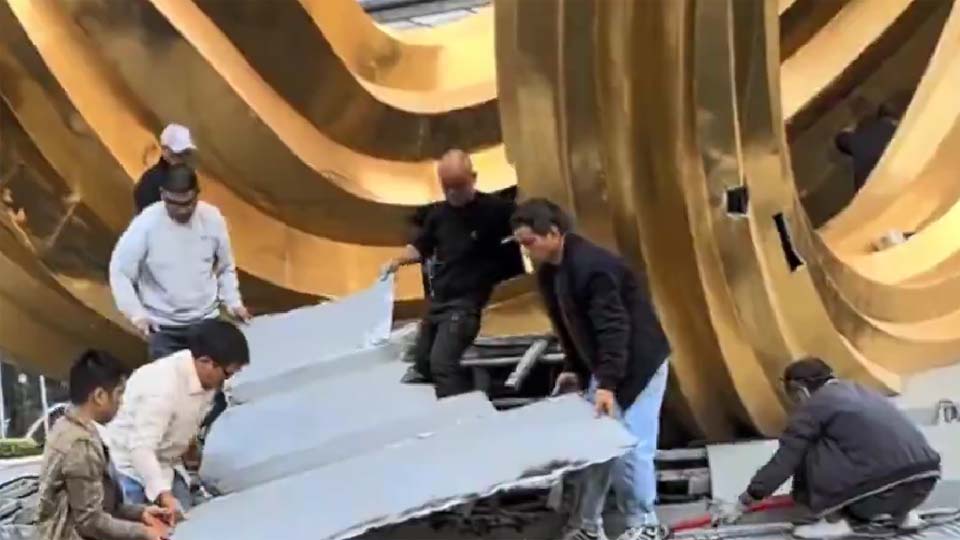 「广东广州:地标雕塑因拖欠工资遭工人强拆(2025.01.08)」位于广东广州南沙区的地标性建筑越秀金融中心外的一座巨型金色雕塑,因拖欠工程款以及建筑工人工资,周三被讨薪工人强行拆除。… pic.twitter.com/AyX0AiqaZe
