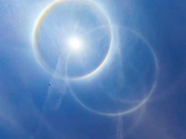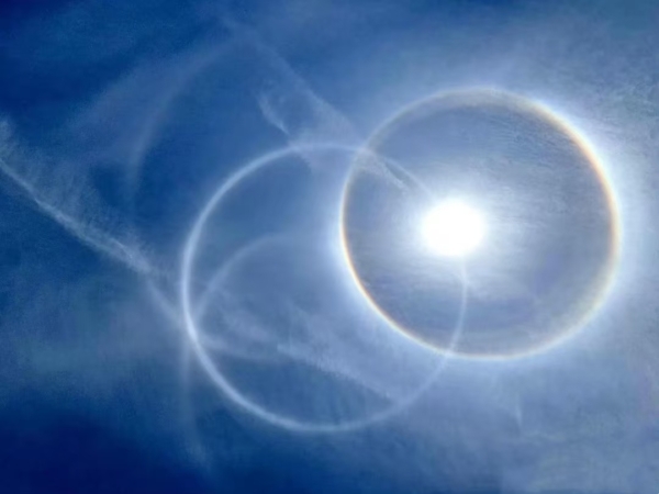 其中有照片顯示,太陽外圍出現多個光圈,一層又一層,各層的大小、亮度不一。另外,在這一圈圈日暈之外,還有另外的多個光圈和圓弧,互相交叉重疊,非常壯觀。