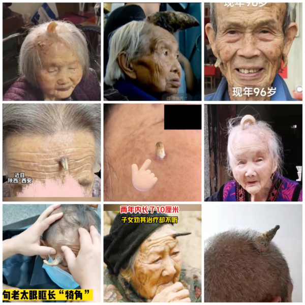 搜索發現,過去曾發生過多起老人長「犄角」的事件,並且多發生在長壽老人身上,犄角多長在額頭上,也有在頭頂,甚至是臉頰。