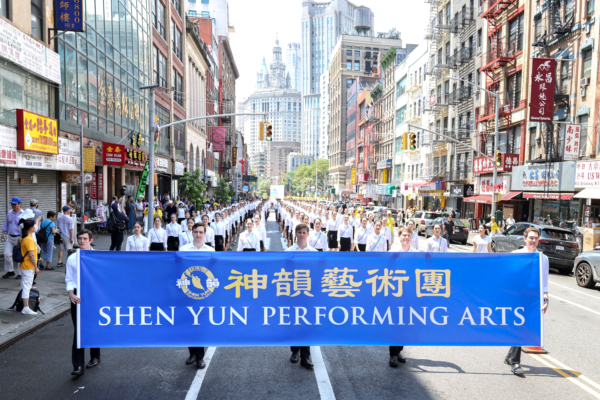 2025年7月20日,神韻部分藝術家在曼哈頓華埠舉行盛大遊行,舉著寫有「神韻藝術團」的橫幅。(Benny Zhang/The Epoch Times)