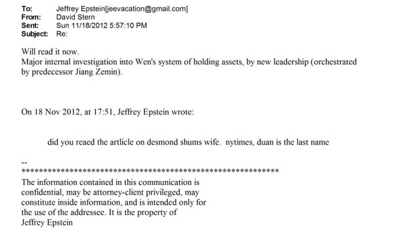 在電郵中,愛潑斯坦詢問斯特恩:「你有沒有看到《紐約時報》關於沈棟(英文名:Desmond Shum)妻子的那篇報導?姓段的那個。」
