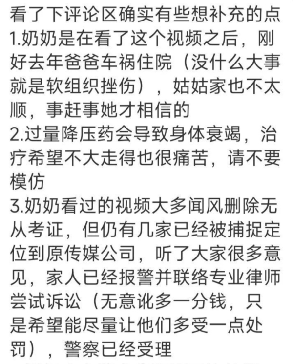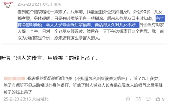 文章說,前幾天刷到一條微博,說一位89歲的長壽奶奶,被反智視頻「逼到自殺」了,該老人一直身體健康結果去年年底,突然吃了兩整瓶的降壓藥自殺,被送去醫院搶救無效,很快走了。