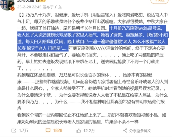 該網友介紹,從去年10月起,老人就刷到講「老人長壽是吸了家裡人福氣」的短視頻,信以為真,而且類似視頻越搜越多,弄得她心裡發虛,過得提心吊膽,就怕自己真的耽誤了家人。儘管表面上沒表現出來,但每天夜裡都去搜索「老人怎麼不吸福」、「老人長壽躲災」,尋求解決方法。