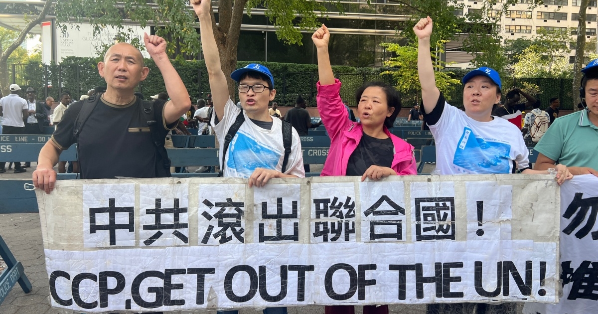 週二(9月23日)聯合國大會一開幕,海外的民主團體和抗議者就在聯合國總部外和中共駐聯合國代表團大樓外,高喊口號,並掛出「中共滾出聯合國」、「End CCP,信仰自由」、「911、新冠,中共是罪魁禍首」等橫幅。