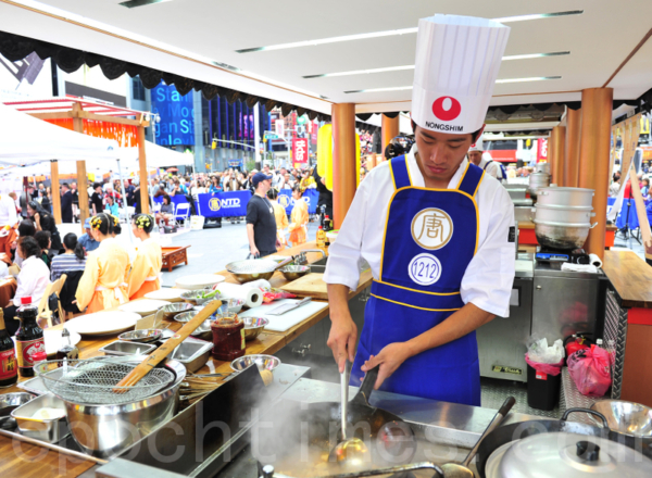 2011年、2016年,新唐人廚技大賽來到了紐約時代廣場。一面大鑼響敲,啓動了大賽。悠揚的古典樂聲中,身穿深青圍裙的參賽廚師走向仿唐風,青瓦為頂的廚房;身穿橘色古裝的侍女站立在兩旁。路中間是幾座畫著敦煌圖案的大圓傘,傘下是供人坐下,品嚐美食的桌椅。古長安與中華傳統文化再現紐約,令來自四方的遊客驚艷。